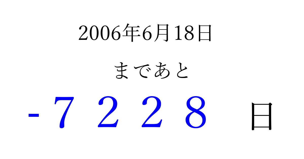 2006年6月18日(日)は もう 0000 日過ぎました 追加すると、トップページからすぐ選べるようになります ※2026/04/02現在の結果です。 最新の状態に更新する ↓シェアして、タイムライン上にカウントダウンを表示しよう!↓ 📤 この結果を共有する Tweet シェア Threads Bluesky 別の日付でカウントダウン 2006年6月のカレンダー このページをブックマークに追加すると、いつでもカウントダウンを確認できます。 (PC: Ctrl+D / Mac: ⌘+D) hitome-notes.comでは以下のページも運営しています。 指定日と期間から日付を計算 | ガチャ確率計算・シミュレーション | プライバシー・ポリシー 運営者:Avocado