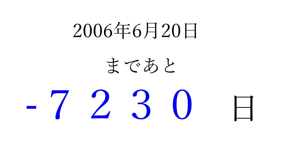 2006年6月20日(火)は もう 0000 日過ぎました 追加すると、トップページからすぐ選べるようになります ※2026/04/06現在の結果です。 最新の状態に更新する ↓シェアして、タイムライン上にカウントダウンを表示しよう!↓ 📤 この結果を共有する Tweet シェア Threads Bluesky 別の日付でカウントダウン 2006年6月のカレンダー このページをブックマークに追加すると、いつでもカウントダウンを確認できます。 (PC: Ctrl+D / Mac: ⌘+D) hitome-notes.comでは以下のページも運営しています。 指定日と期間から日付を計算 | ガチャ確率計算・シミュレーション | プライバシー・ポリシー 運営者:Avocado