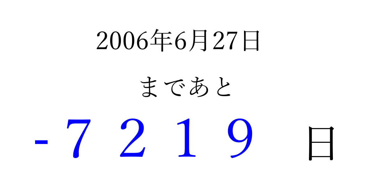 2006年6月27日(火)は もう 0000 日過ぎました 追加すると、トップページからすぐ選べるようになります ※2026/04/02現在の結果です。 最新の状態に更新する ↓シェアして、タイムライン上にカウントダウンを表示しよう!↓ 📤 この結果を共有する Tweet シェア Threads Bluesky 別の日付でカウントダウン 2006年6月のカレンダー このページをブックマークに追加すると、いつでもカウントダウンを確認できます。 (PC: Ctrl+D / Mac: ⌘+D) hitome-notes.comでは以下のページも運営しています。 指定日と期間から日付を計算 | ガチャ確率計算・シミュレーション | プライバシー・ポリシー 運営者:Avocado