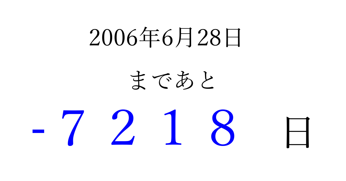 2006年6月28日(水)は もう 0000 日過ぎました 追加すると、トップページからすぐ選べるようになります ※2026/04/02現在の結果です。 最新の状態に更新する ↓シェアして、タイムライン上にカウントダウンを表示しよう!↓ 📤 この結果を共有する Tweet シェア Threads Bluesky 別の日付でカウントダウン 2006年6月のカレンダー このページをブックマークに追加すると、いつでもカウントダウンを確認できます。 (PC: Ctrl+D / Mac: ⌘+D) hitome-notes.comでは以下のページも運営しています。 指定日と期間から日付を計算 | ガチャ確率計算・シミュレーション | プライバシー・ポリシー 運営者:Avocado