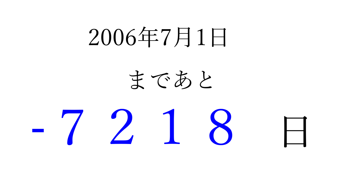 2006年7月1日(土)は もう 0000 日過ぎました 追加すると、トップページからすぐ選べるようになります ※2026/04/05現在の結果です。 最新の状態に更新する ↓シェアして、タイムライン上にカウントダウンを表示しよう!↓ 📤 この結果を共有する Tweet シェア Threads Bluesky 別の日付でカウントダウン 2006年7月のカレンダー このページをブックマークに追加すると、いつでもカウントダウンを確認できます。 (PC: Ctrl+D / Mac: ⌘+D) hitome-notes.comでは以下のページも運営しています。 指定日と期間から日付を計算 | ガチャ確率計算・シミュレーション | プライバシー・ポリシー 運営者:Avocado