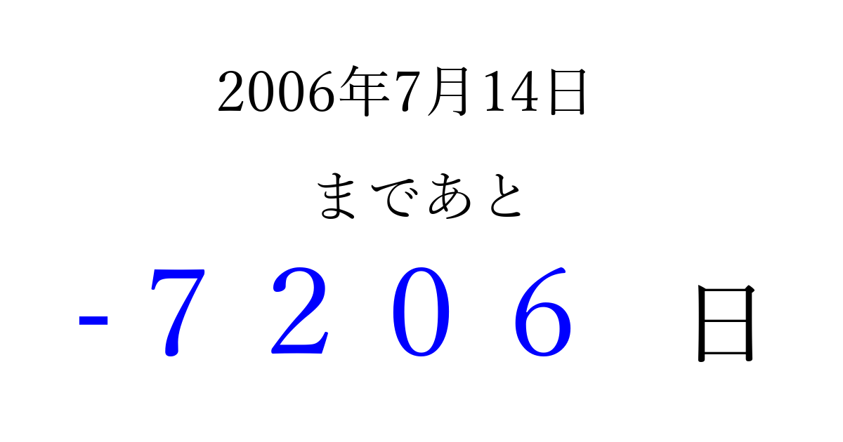 2006年7月14日(金)は もう 0000 日過ぎました 追加すると、トップページからすぐ選べるようになります ※2026/04/06現在の結果です。 最新の状態に更新する ↓シェアして、タイムライン上にカウントダウンを表示しよう!↓ 📤 この結果を共有する Tweet シェア Threads Bluesky 別の日付でカウントダウン 2006年7月のカレンダー このページをブックマークに追加すると、いつでもカウントダウンを確認できます。 (PC: Ctrl+D / Mac: ⌘+D) hitome-notes.comでは以下のページも運営しています。 指定日と期間から日付を計算 | ガチャ確率計算・シミュレーション | プライバシー・ポリシー 運営者:Avocado