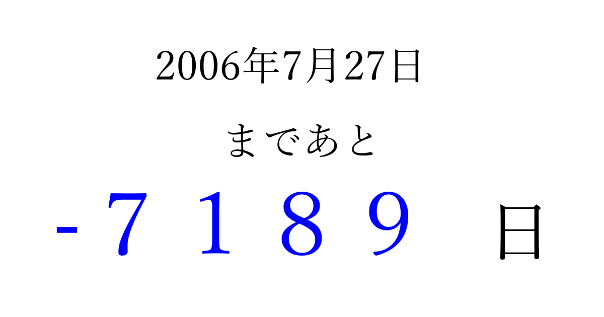 2006年7月27日(木)は もう 0000 日過ぎました 追加すると、トップページからすぐ選べるようになります ※2026/04/02現在の結果です。 最新の状態に更新する ↓シェアして、タイムライン上にカウントダウンを表示しよう!↓ 📤 この結果を共有する Tweet シェア Threads Bluesky 別の日付でカウントダウン 2006年7月のカレンダー このページをブックマークに追加すると、いつでもカウントダウンを確認できます。 (PC: Ctrl+D / Mac: ⌘+D) hitome-notes.comでは以下のページも運営しています。 指定日と期間から日付を計算 | ガチャ確率計算・シミュレーション | プライバシー・ポリシー 運営者:Avocado
