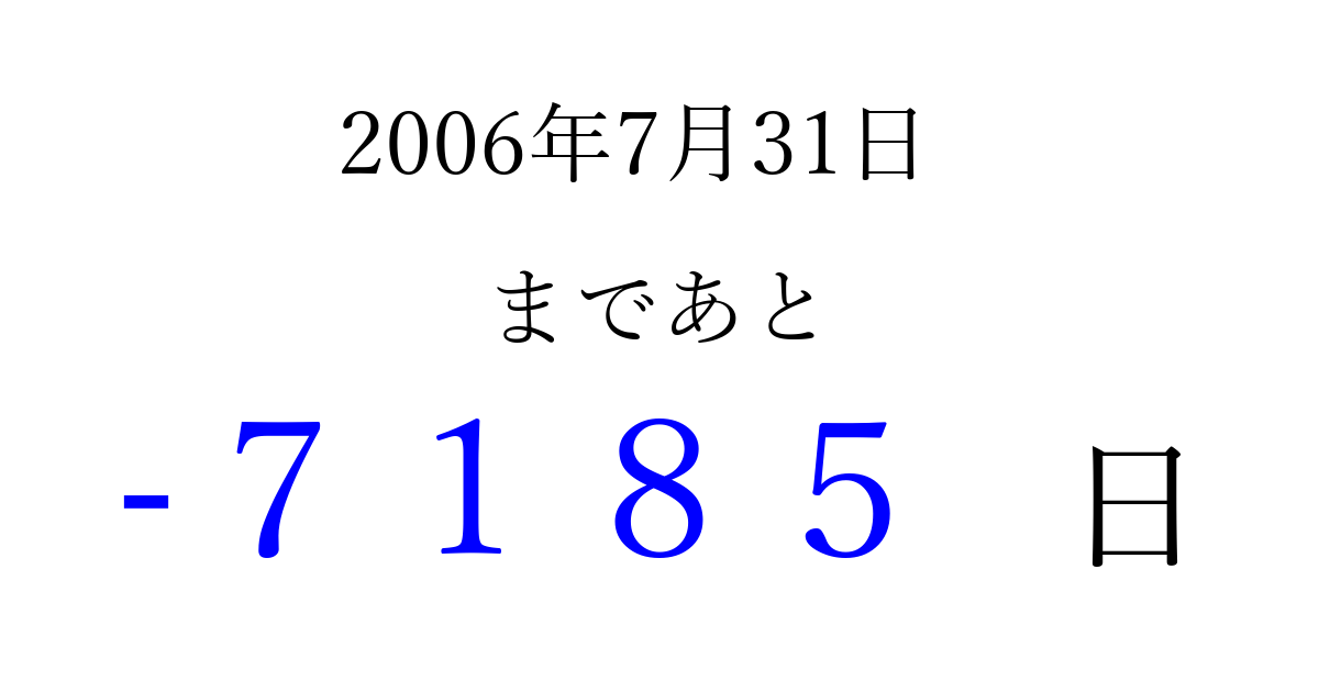 2006年7月31日(月)は もう 0000 日過ぎました 追加すると、トップページからすぐ選べるようになります ※2026/04/02現在の結果です。 最新の状態に更新する ↓シェアして、タイムライン上にカウントダウンを表示しよう!↓ 📤 この結果を共有する Tweet シェア Threads Bluesky 別の日付でカウントダウン 2006年7月のカレンダー このページをブックマークに追加すると、いつでもカウントダウンを確認できます。 (PC: Ctrl+D / Mac: ⌘+D) hitome-notes.comでは以下のページも運営しています。 指定日と期間から日付を計算 | ガチャ確率計算・シミュレーション | プライバシー・ポリシー 運営者:Avocado