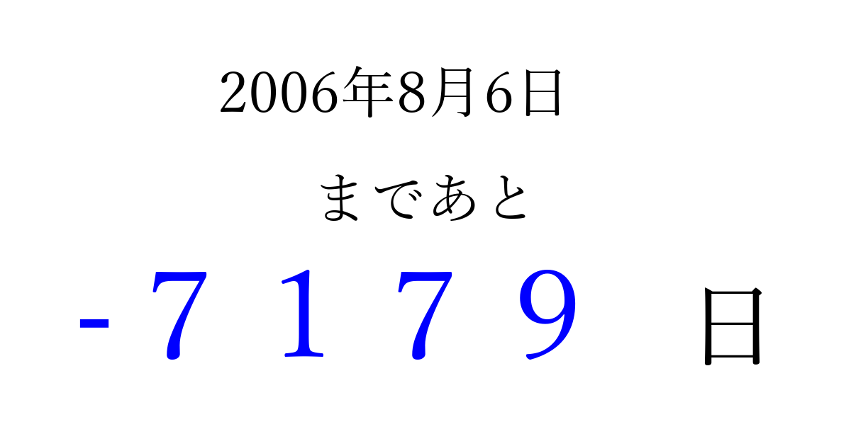 2006年8月6日(日)は もう 0000 日過ぎました 追加すると、トップページからすぐ選べるようになります ※2026/04/02現在の結果です。 最新の状態に更新する ↓シェアして、タイムライン上にカウントダウンを表示しよう!↓ 📤 この結果を共有する Tweet シェア Threads Bluesky 別の日付でカウントダウン 2006年8月のカレンダー このページをブックマークに追加すると、いつでもカウントダウンを確認できます。 (PC: Ctrl+D / Mac: ⌘+D) hitome-notes.comでは以下のページも運営しています。 指定日と期間から日付を計算 | ガチャ確率計算・シミュレーション | プライバシー・ポリシー 運営者:Avocado