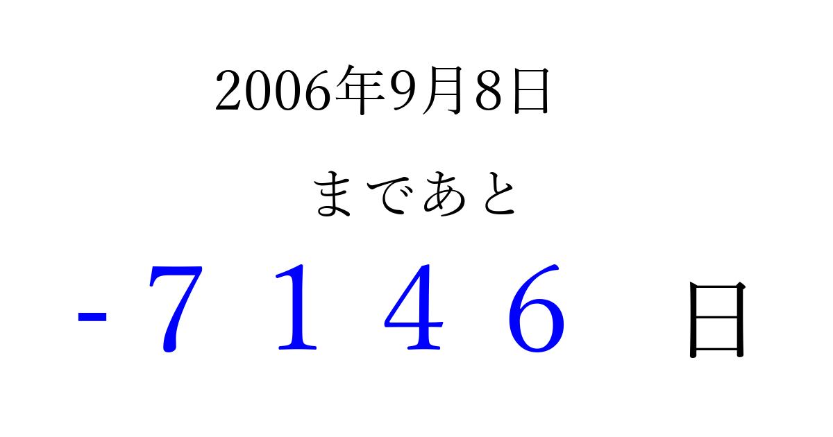 2006年9月8日(金)は もう 0000 日過ぎました 追加すると、トップページからすぐ選べるようになります ※2026/04/02現在の結果です。 最新の状態に更新する ↓シェアして、タイムライン上にカウントダウンを表示しよう!↓ 📤 この結果を共有する Tweet シェア Threads Bluesky 別の日付でカウントダウン 2006年9月のカレンダー このページをブックマークに追加すると、いつでもカウントダウンを確認できます。 (PC: Ctrl+D / Mac: ⌘+D) hitome-notes.comでは以下のページも運営しています。 指定日と期間から日付を計算 | ガチャ確率計算・シミュレーション | プライバシー・ポリシー 運営者:Avocado