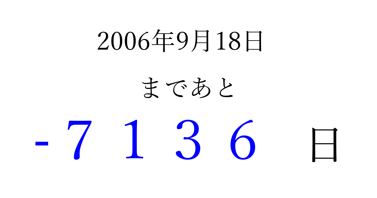 2006年9月18日(月)は もう 0000 日過ぎました 追加すると、トップページからすぐ選べるようになります ※2026/04/02現在の結果です。 最新の状態に更新する ↓シェアして、タイムライン上にカウントダウンを表示しよう!↓ 📤 この結果を共有する Tweet シェア Threads Bluesky 別の日付でカウントダウン 2006年9月のカレンダー このページをブックマークに追加すると、いつでもカウントダウンを確認できます。 (PC: Ctrl+D / Mac: ⌘+D) hitome-notes.comでは以下のページも運営しています。 指定日と期間から日付を計算 | ガチャ確率計算・シミュレーション | プライバシー・ポリシー 運営者:Avocado