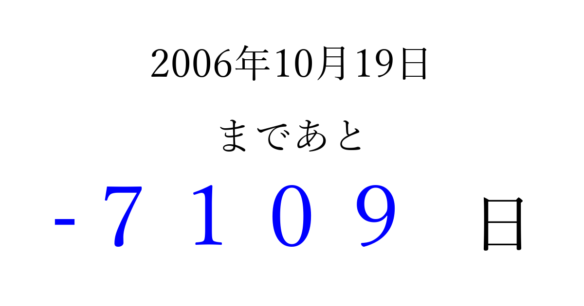 2006年10月19日(木)は もう 0000 日過ぎました 追加すると、トップページからすぐ選べるようになります ※2026/04/06現在の結果です。 最新の状態に更新する ↓シェアして、タイムライン上にカウントダウンを表示しよう!↓ 📤 この結果を共有する Tweet シェア Threads Bluesky 別の日付でカウントダウン 2006年10月のカレンダー このページをブックマークに追加すると、いつでもカウントダウンを確認できます。 (PC: Ctrl+D / Mac: ⌘+D) hitome-notes.comでは以下のページも運営しています。 指定日と期間から日付を計算 | ガチャ確率計算・シミュレーション | プライバシー・ポリシー 運営者:Avocado