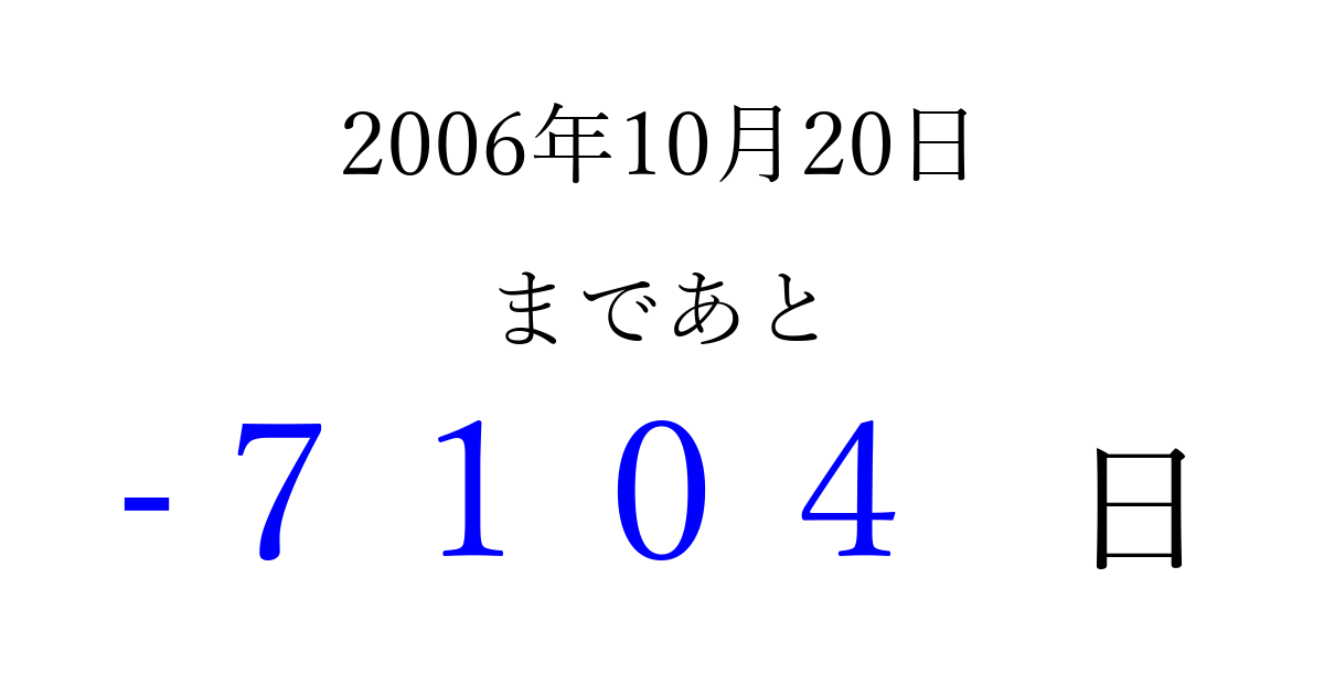 2006年10月20日(金)は もう 0000 日過ぎました 追加すると、トップページからすぐ選べるようになります ※2026/04/02現在の結果です。 最新の状態に更新する ↓シェアして、タイムライン上にカウントダウンを表示しよう!↓ 📤 この結果を共有する Tweet シェア Threads Bluesky 別の日付でカウントダウン 2006年10月のカレンダー このページをブックマークに追加すると、いつでもカウントダウンを確認できます。 (PC: Ctrl+D / Mac: ⌘+D) hitome-notes.comでは以下のページも運営しています。 指定日と期間から日付を計算 | ガチャ確率計算・シミュレーション | プライバシー・ポリシー 運営者:Avocado
