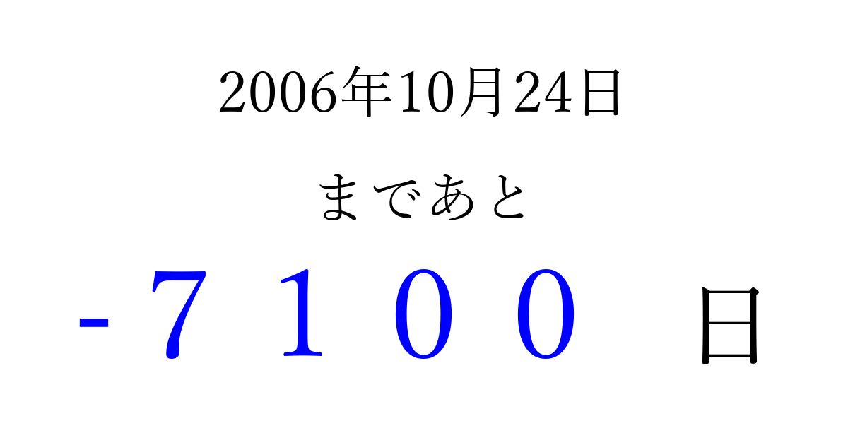 2006年10月24日(火)は もう 0000 日過ぎました 追加すると、トップページからすぐ選べるようになります ※2026/04/02現在の結果です。 最新の状態に更新する ↓シェアして、タイムライン上にカウントダウンを表示しよう!↓ 📤 この結果を共有する Tweet シェア Threads Bluesky 別の日付でカウントダウン 2006年10月のカレンダー このページをブックマークに追加すると、いつでもカウントダウンを確認できます。 (PC: Ctrl+D / Mac: ⌘+D) hitome-notes.comでは以下のページも運営しています。 指定日と期間から日付を計算 | ガチャ確率計算・シミュレーション | プライバシー・ポリシー 運営者:Avocado