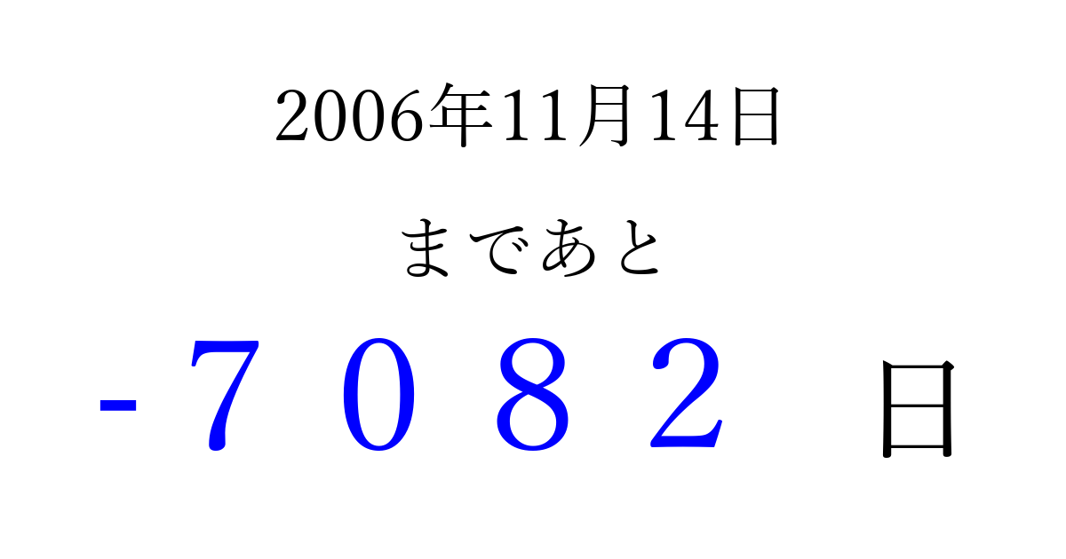 2006年11月14日(火)は もう 0000 日過ぎました 追加すると、トップページからすぐ選べるようになります ※2026/04/05現在の結果です。 最新の状態に更新する ↓シェアして、タイムライン上にカウントダウンを表示しよう!↓ 📤 この結果を共有する Tweet シェア Threads Bluesky 別の日付でカウントダウン 2006年11月のカレンダー このページをブックマークに追加すると、いつでもカウントダウンを確認できます。 (PC: Ctrl+D / Mac: ⌘+D) hitome-notes.comでは以下のページも運営しています。 指定日と期間から日付を計算 | ガチャ確率計算・シミュレーション | プライバシー・ポリシー 運営者:Avocado
