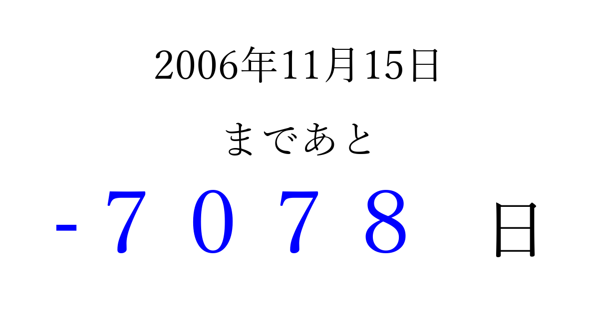 2006年11月15日(水)は もう 0000 日過ぎました 追加すると、トップページからすぐ選べるようになります ※2026/04/02現在の結果です。 最新の状態に更新する ↓シェアして、タイムライン上にカウントダウンを表示しよう!↓ 📤 この結果を共有する Tweet シェア Threads Bluesky 別の日付でカウントダウン 2006年11月のカレンダー このページをブックマークに追加すると、いつでもカウントダウンを確認できます。 (PC: Ctrl+D / Mac: ⌘+D) hitome-notes.comでは以下のページも運営しています。 指定日と期間から日付を計算 | ガチャ確率計算・シミュレーション | プライバシー・ポリシー 運営者:Avocado