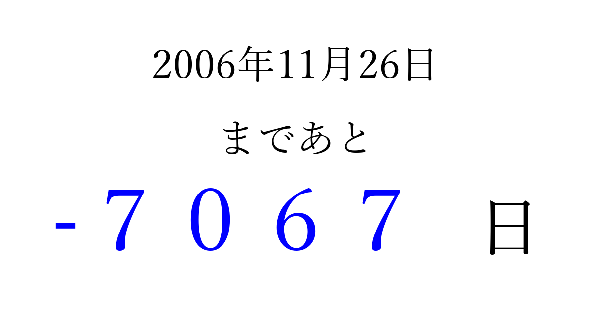 2006年11月26日(日)は もう 0000 日過ぎました 追加すると、トップページからすぐ選べるようになります ※2026/04/02現在の結果です。 最新の状態に更新する ↓シェアして、タイムライン上にカウントダウンを表示しよう!↓ 📤 この結果を共有する Tweet シェア Threads Bluesky 別の日付でカウントダウン 2006年11月のカレンダー このページをブックマークに追加すると、いつでもカウントダウンを確認できます。 (PC: Ctrl+D / Mac: ⌘+D) hitome-notes.comでは以下のページも運営しています。 指定日と期間から日付を計算 | ガチャ確率計算・シミュレーション | プライバシー・ポリシー 運営者:Avocado