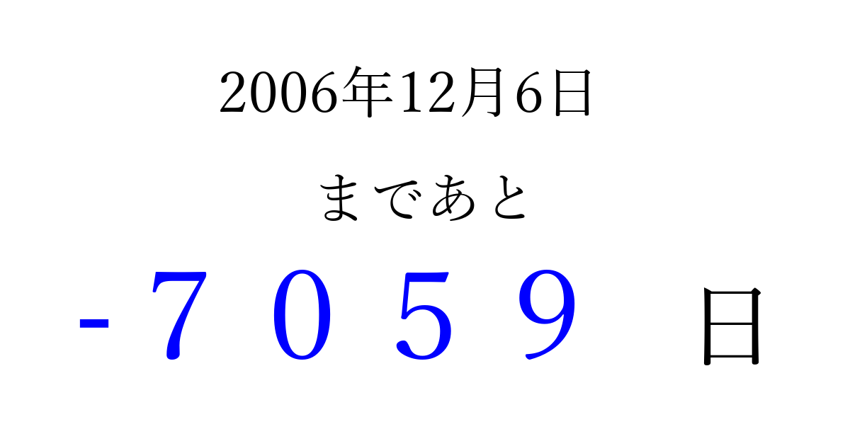 2006年12月6日(水)は もう 0000 日過ぎました 追加すると、トップページからすぐ選べるようになります ※2026/04/04現在の結果です。 最新の状態に更新する ↓シェアして、タイムライン上にカウントダウンを表示しよう!↓ 📤 この結果を共有する Tweet シェア Threads Bluesky 別の日付でカウントダウン 2006年12月のカレンダー このページをブックマークに追加すると、いつでもカウントダウンを確認できます。 (PC: Ctrl+D / Mac: ⌘+D) hitome-notes.comでは以下のページも運営しています。 指定日と期間から日付を計算 | ガチャ確率計算・シミュレーション | プライバシー・ポリシー 運営者:Avocado