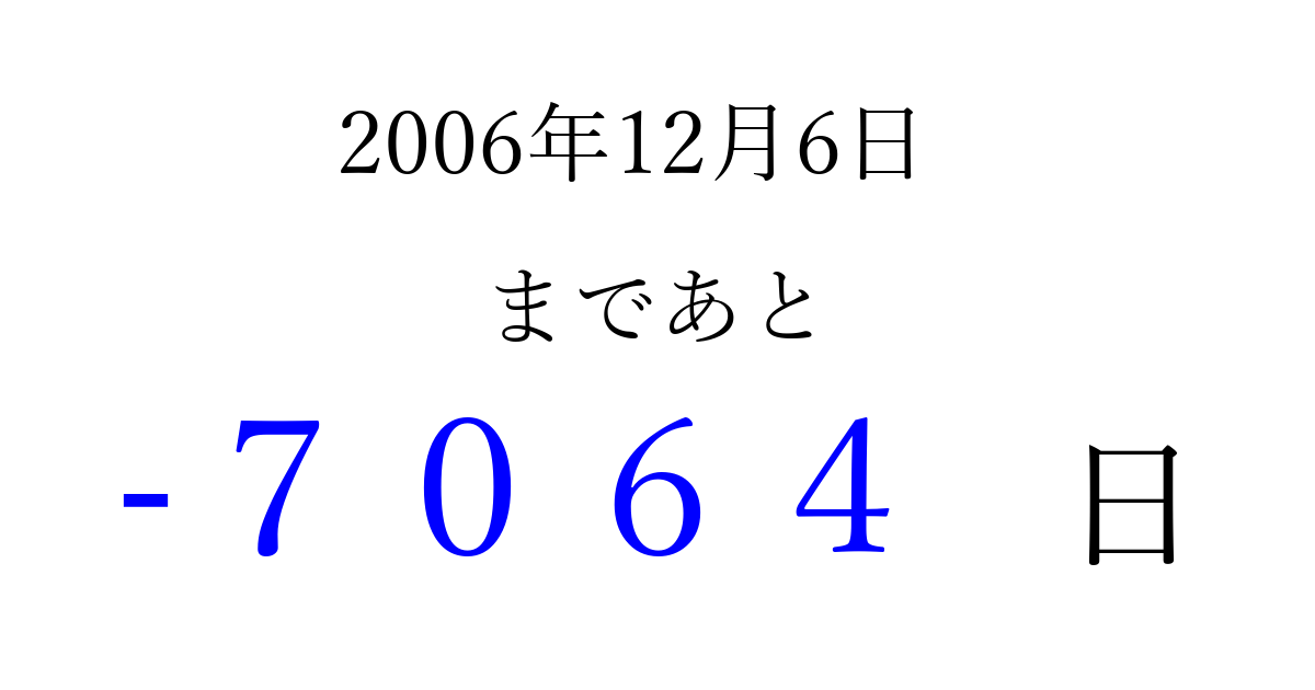 2006年12月6日(水)は もう 0000 日過ぎました 追加すると、トップページからすぐ選べるようになります ※2026/04/09現在の結果です。 最新の状態に更新する ↓シェアして、タイムライン上にカウントダウンを表示しよう!↓ 📤 この結果を共有する Tweet シェア Threads Bluesky 別の日付でカウントダウン 2006年12月のカレンダー このページをブックマークに追加すると、いつでもカウントダウンを確認できます。 (PC: Ctrl+D / Mac: ⌘+D) hitome-notes.comでは以下のページも運営しています。 指定日と期間から日付を計算 | ガチャ確率計算・シミュレーション | プライバシー・ポリシー 運営者:Avocado