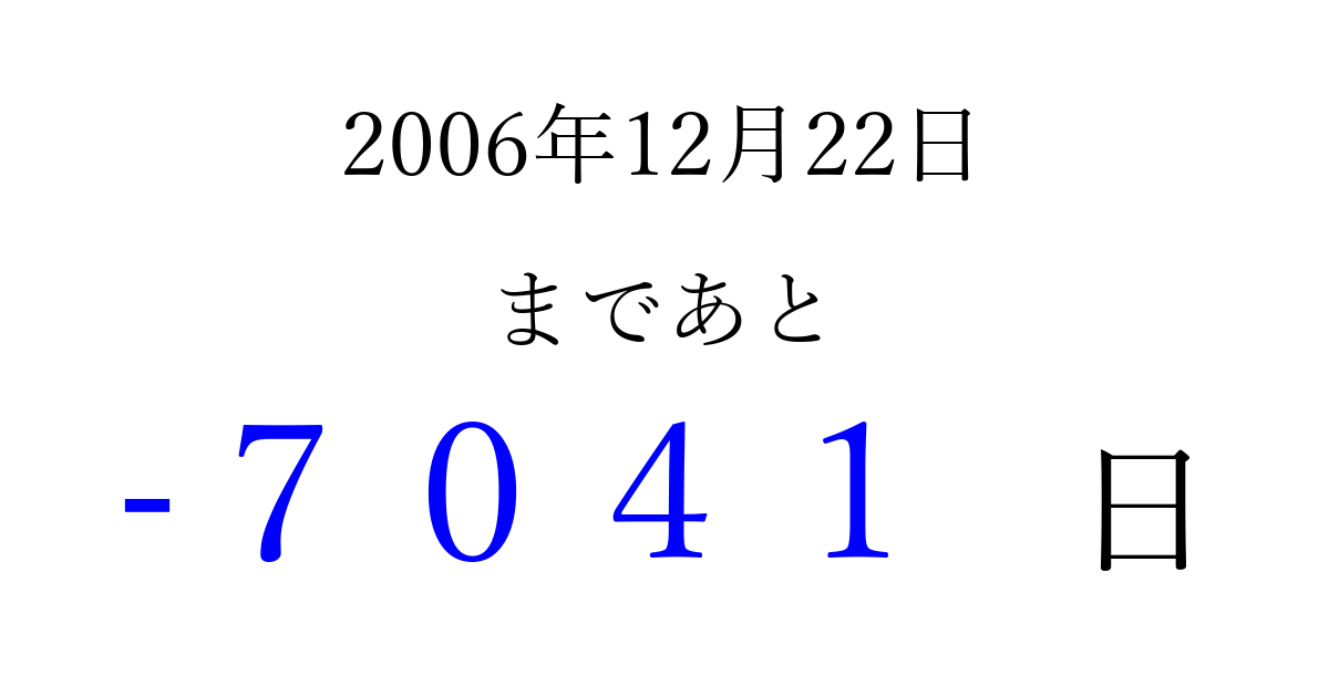 2006年12月22日(金)は もう 0000 日過ぎました 追加すると、トップページからすぐ選べるようになります ※2026/04/02現在の結果です。 最新の状態に更新する ↓シェアして、タイムライン上にカウントダウンを表示しよう!↓ 📤 この結果を共有する Tweet シェア Threads Bluesky 別の日付でカウントダウン 2006年12月のカレンダー このページをブックマークに追加すると、いつでもカウントダウンを確認できます。 (PC: Ctrl+D / Mac: ⌘+D) hitome-notes.comでは以下のページも運営しています。 指定日と期間から日付を計算 | ガチャ確率計算・シミュレーション | プライバシー・ポリシー 運営者:Avocado