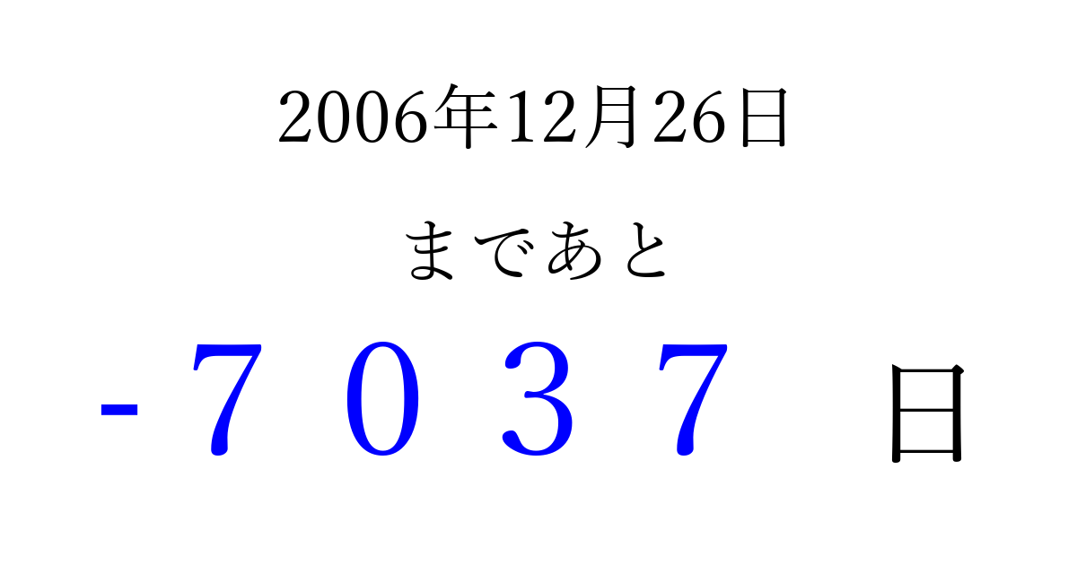 2006年12月26日(火)は もう 0000 日過ぎました 追加すると、トップページからすぐ選べるようになります ※2026/04/02現在の結果です。 最新の状態に更新する ↓シェアして、タイムライン上にカウントダウンを表示しよう!↓ 📤 この結果を共有する Tweet シェア Threads Bluesky 別の日付でカウントダウン 2006年12月のカレンダー このページをブックマークに追加すると、いつでもカウントダウンを確認できます。 (PC: Ctrl+D / Mac: ⌘+D) hitome-notes.comでは以下のページも運営しています。 指定日と期間から日付を計算 | ガチャ確率計算・シミュレーション | プライバシー・ポリシー 運営者:Avocado