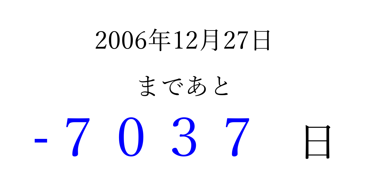 2006年12月27日(水)は もう 0000 日過ぎました 追加すると、トップページからすぐ選べるようになります ※2026/04/03現在の結果です。 最新の状態に更新する ↓シェアして、タイムライン上にカウントダウンを表示しよう!↓ 📤 この結果を共有する Tweet シェア Threads Bluesky 別の日付でカウントダウン 2006年12月のカレンダー このページをブックマークに追加すると、いつでもカウントダウンを確認できます。 (PC: Ctrl+D / Mac: ⌘+D) hitome-notes.comでは以下のページも運営しています。 指定日と期間から日付を計算 | ガチャ確率計算・シミュレーション | プライバシー・ポリシー 運営者:Avocado