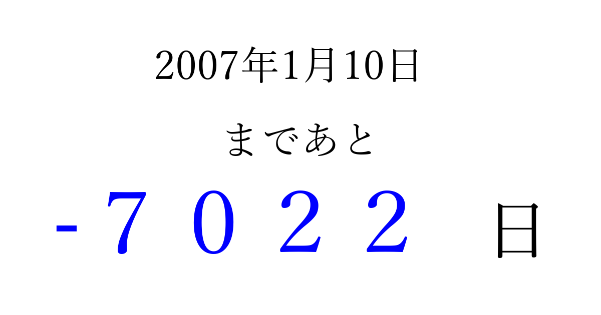 2007年1月10日(水)は もう 0000 日過ぎました 追加すると、トップページからすぐ選べるようになります ※2026/04/02現在の結果です。 最新の状態に更新する ↓シェアして、タイムライン上にカウントダウンを表示しよう!↓ 📤 この結果を共有する Tweet シェア Threads Bluesky 別の日付でカウントダウン 2007年1月のカレンダー このページをブックマークに追加すると、いつでもカウントダウンを確認できます。 (PC: Ctrl+D / Mac: ⌘+D) hitome-notes.comでは以下のページも運営しています。 指定日と期間から日付を計算 | ガチャ確率計算・シミュレーション | プライバシー・ポリシー 運営者:Avocado