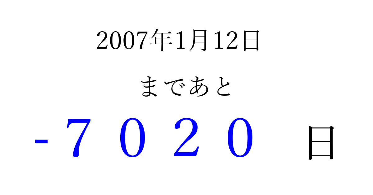 2007年1月12日(金)は もう 0000 日過ぎました 追加すると、トップページからすぐ選べるようになります ※2026/04/02現在の結果です。 最新の状態に更新する ↓シェアして、タイムライン上にカウントダウンを表示しよう!↓ 📤 この結果を共有する Tweet シェア Threads Bluesky 別の日付でカウントダウン 2007年1月のカレンダー このページをブックマークに追加すると、いつでもカウントダウンを確認できます。 (PC: Ctrl+D / Mac: ⌘+D) hitome-notes.comでは以下のページも運営しています。 指定日と期間から日付を計算 | ガチャ確率計算・シミュレーション | プライバシー・ポリシー 運営者:Avocado