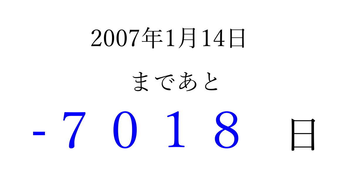 2007年1月14日(日)は もう 0000 日過ぎました 追加すると、トップページからすぐ選べるようになります ※2026/04/02現在の結果です。 最新の状態に更新する ↓シェアして、タイムライン上にカウントダウンを表示しよう!↓ 📤 この結果を共有する Tweet シェア Threads Bluesky 別の日付でカウントダウン 2007年1月のカレンダー このページをブックマークに追加すると、いつでもカウントダウンを確認できます。 (PC: Ctrl+D / Mac: ⌘+D) hitome-notes.comでは以下のページも運営しています。 指定日と期間から日付を計算 | ガチャ確率計算・シミュレーション | プライバシー・ポリシー 運営者:Avocado