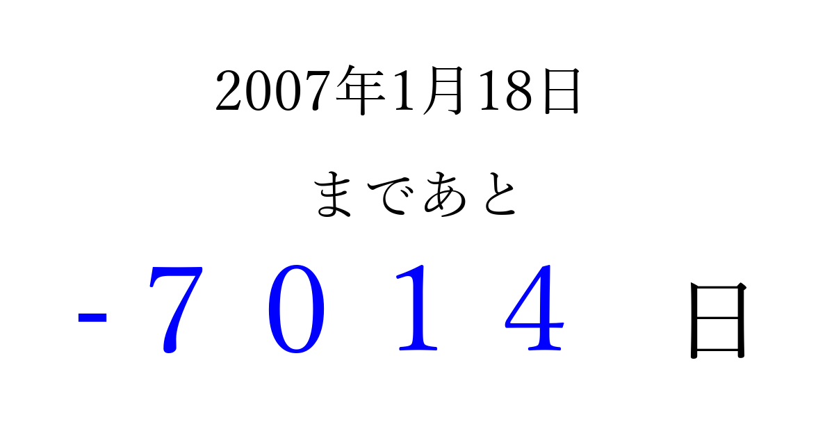 2007年1月18日(木)は もう 0000 日過ぎました 追加すると、トップページからすぐ選べるようになります ※2026/04/02現在の結果です。 最新の状態に更新する ↓シェアして、タイムライン上にカウントダウンを表示しよう!↓ 📤 この結果を共有する Tweet シェア Threads Bluesky 別の日付でカウントダウン 2007年1月のカレンダー このページをブックマークに追加すると、いつでもカウントダウンを確認できます。 (PC: Ctrl+D / Mac: ⌘+D) hitome-notes.comでは以下のページも運営しています。 指定日と期間から日付を計算 | ガチャ確率計算・シミュレーション | プライバシー・ポリシー 運営者:Avocado
