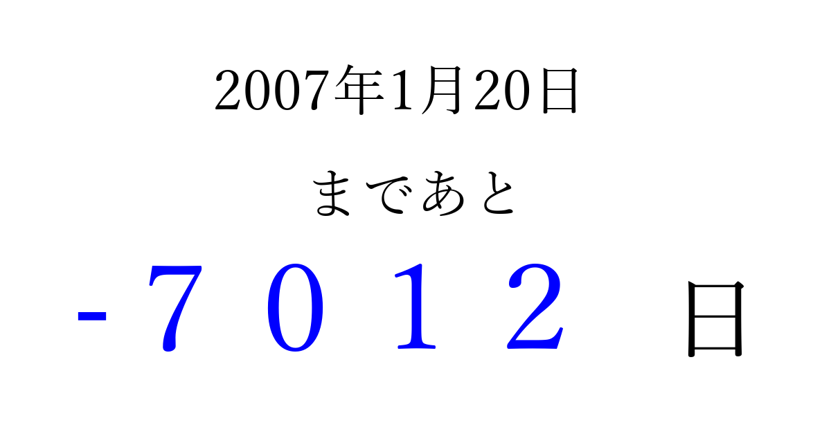 2007年1月20日(土)は もう 0000 日過ぎました 追加すると、トップページからすぐ選べるようになります ※2026/04/02現在の結果です。 最新の状態に更新する ↓シェアして、タイムライン上にカウントダウンを表示しよう!↓ 📤 この結果を共有する Tweet シェア Threads Bluesky 別の日付でカウントダウン 2007年1月のカレンダー このページをブックマークに追加すると、いつでもカウントダウンを確認できます。 (PC: Ctrl+D / Mac: ⌘+D) hitome-notes.comでは以下のページも運営しています。 指定日と期間から日付を計算 | ガチャ確率計算・シミュレーション | プライバシー・ポリシー 運営者:Avocado
