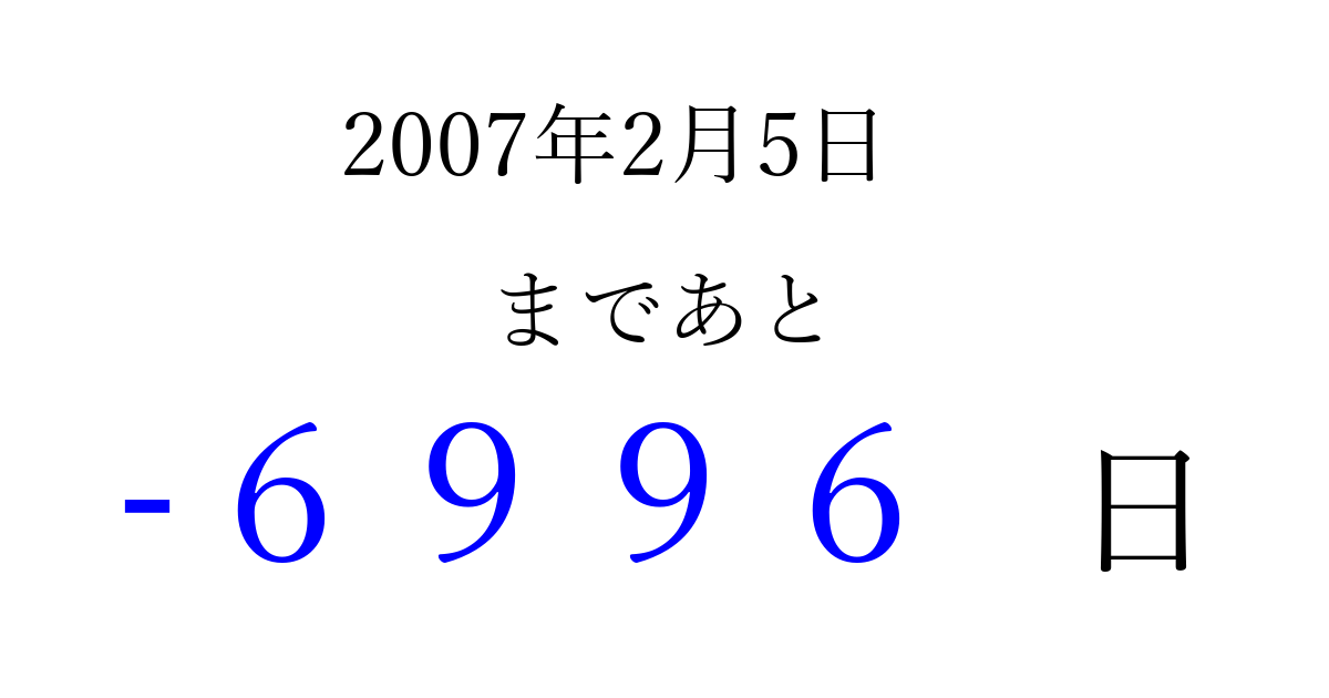 2007年2月5日(月)は もう 0000 日過ぎました 追加すると、トップページからすぐ選べるようになります ※2026/04/02現在の結果です。 最新の状態に更新する ↓シェアして、タイムライン上にカウントダウンを表示しよう!↓ 📤 この結果を共有する Tweet シェア Threads Bluesky 別の日付でカウントダウン 2007年2月のカレンダー このページをブックマークに追加すると、いつでもカウントダウンを確認できます。 (PC: Ctrl+D / Mac: ⌘+D) hitome-notes.comでは以下のページも運営しています。 指定日と期間から日付を計算 | ガチャ確率計算・シミュレーション | プライバシー・ポリシー 運営者:Avocado