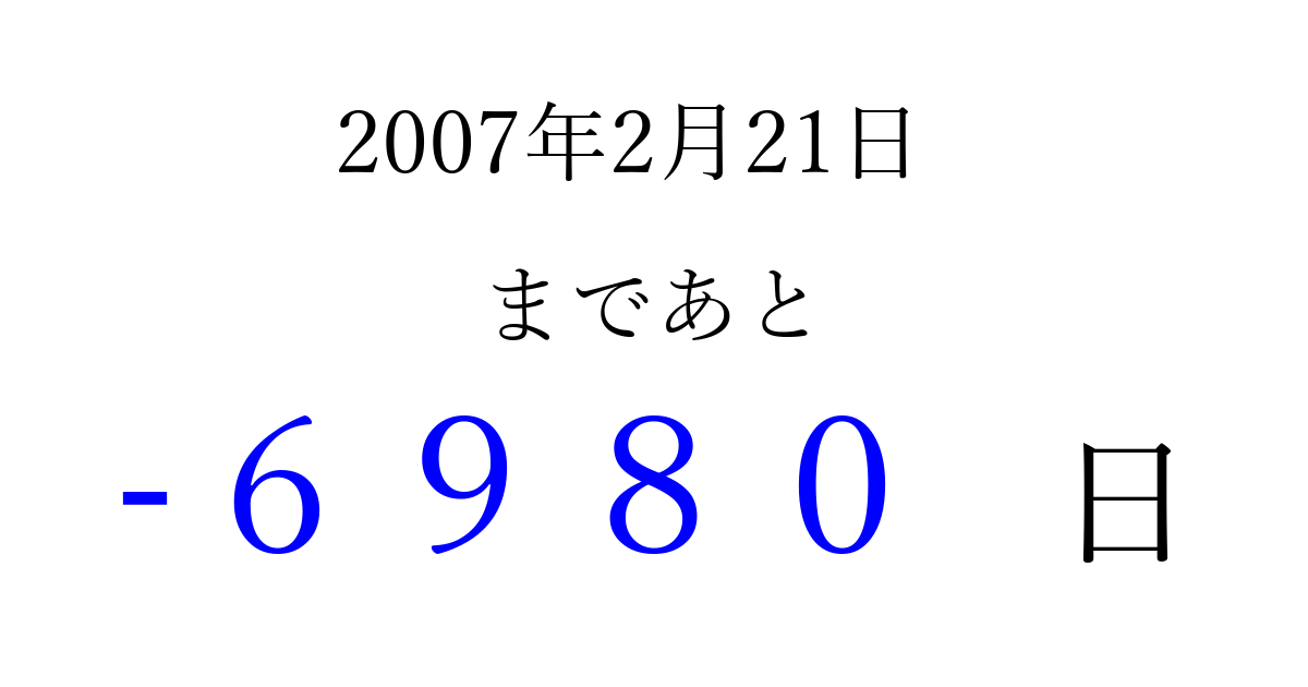 2007年2月21日(水)は もう 0000 日過ぎました 追加すると、トップページからすぐ選べるようになります ※2026/04/02現在の結果です。 最新の状態に更新する ↓シェアして、タイムライン上にカウントダウンを表示しよう!↓ 📤 この結果を共有する Tweet シェア Threads Bluesky 別の日付でカウントダウン 2007年2月のカレンダー このページをブックマークに追加すると、いつでもカウントダウンを確認できます。 (PC: Ctrl+D / Mac: ⌘+D) hitome-notes.comでは以下のページも運営しています。 指定日と期間から日付を計算 | ガチャ確率計算・シミュレーション | プライバシー・ポリシー 運営者:Avocado