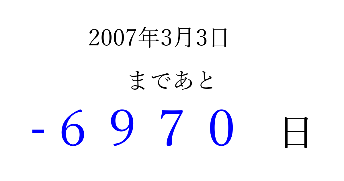 2007年3月3日(土)は もう 0000 日過ぎました 追加すると、トップページからすぐ選べるようになります ※2026/04/02現在の結果です。 最新の状態に更新する ↓シェアして、タイムライン上にカウントダウンを表示しよう!↓ 📤 この結果を共有する Tweet シェア Threads Bluesky 別の日付でカウントダウン 2007年3月のカレンダー このページをブックマークに追加すると、いつでもカウントダウンを確認できます。 (PC: Ctrl+D / Mac: ⌘+D) hitome-notes.comでは以下のページも運営しています。 指定日と期間から日付を計算 | ガチャ確率計算・シミュレーション | プライバシー・ポリシー 運営者:Avocado