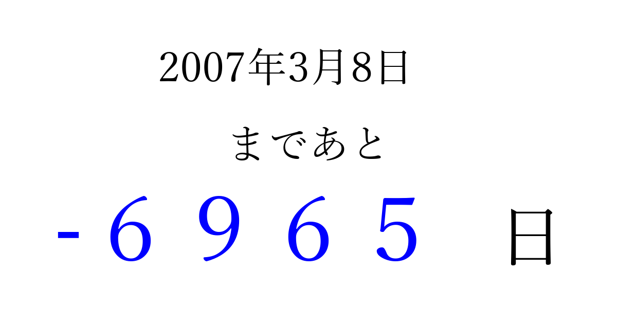 2007年3月8日(木)は もう 0000 日過ぎました 追加すると、トップページからすぐ選べるようになります ※2026/04/02現在の結果です。 最新の状態に更新する ↓シェアして、タイムライン上にカウントダウンを表示しよう!↓ 📤 この結果を共有する Tweet シェア Threads Bluesky 別の日付でカウントダウン 2007年3月のカレンダー このページをブックマークに追加すると、いつでもカウントダウンを確認できます。 (PC: Ctrl+D / Mac: ⌘+D) hitome-notes.comでは以下のページも運営しています。 指定日と期間から日付を計算 | ガチャ確率計算・シミュレーション | プライバシー・ポリシー 運営者:Avocado