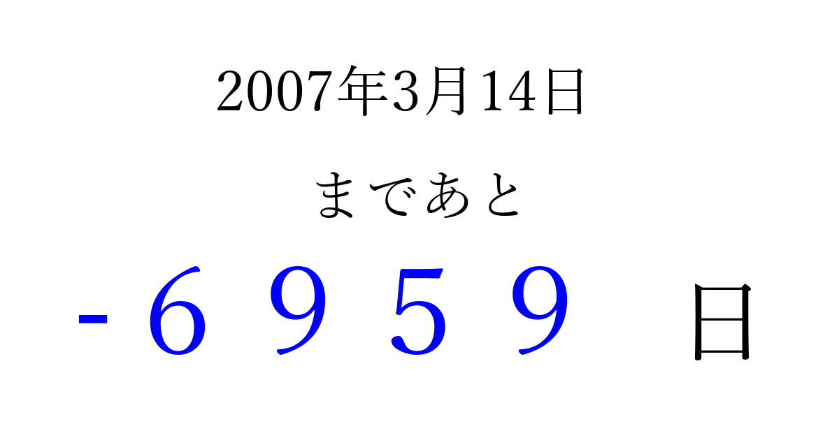 2007年3月14日(水)は もう 0000 日過ぎました 追加すると、トップページからすぐ選べるようになります ※2026/04/02現在の結果です。 最新の状態に更新する ↓シェアして、タイムライン上にカウントダウンを表示しよう!↓ 📤 この結果を共有する Tweet シェア Threads Bluesky 別の日付でカウントダウン 2007年3月のカレンダー このページをブックマークに追加すると、いつでもカウントダウンを確認できます。 (PC: Ctrl+D / Mac: ⌘+D) hitome-notes.comでは以下のページも運営しています。 指定日と期間から日付を計算 | ガチャ確率計算・シミュレーション | プライバシー・ポリシー 運営者:Avocado