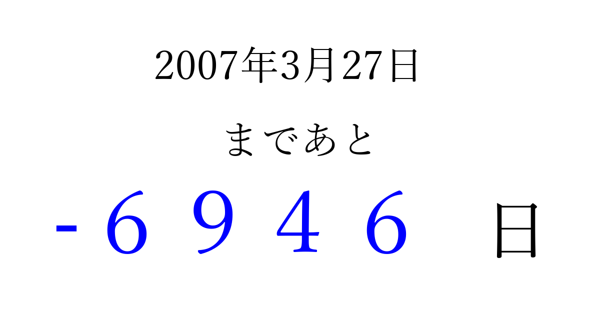 2007年3月27日(火)は もう 0000 日過ぎました 追加すると、トップページからすぐ選べるようになります ※2026/04/02現在の結果です。 最新の状態に更新する ↓シェアして、タイムライン上にカウントダウンを表示しよう!↓ 📤 この結果を共有する Tweet シェア Threads Bluesky 別の日付でカウントダウン 2007年3月のカレンダー このページをブックマークに追加すると、いつでもカウントダウンを確認できます。 (PC: Ctrl+D / Mac: ⌘+D) hitome-notes.comでは以下のページも運営しています。 指定日と期間から日付を計算 | ガチャ確率計算・シミュレーション | プライバシー・ポリシー 運営者:Avocado