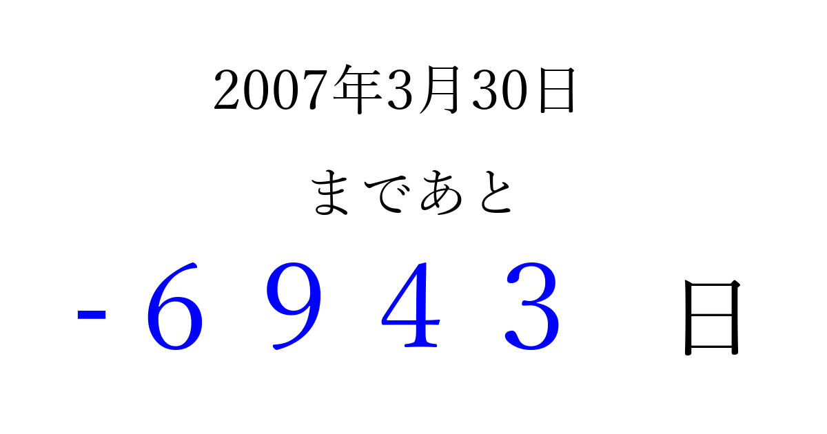 2007年3月30日(金)は もう 0000 日過ぎました 追加すると、トップページからすぐ選べるようになります ※2026/04/02現在の結果です。 最新の状態に更新する ↓シェアして、タイムライン上にカウントダウンを表示しよう!↓ 📤 この結果を共有する Tweet シェア Threads Bluesky 別の日付でカウントダウン 2007年3月のカレンダー このページをブックマークに追加すると、いつでもカウントダウンを確認できます。 (PC: Ctrl+D / Mac: ⌘+D) hitome-notes.comでは以下のページも運営しています。 指定日と期間から日付を計算 | ガチャ確率計算・シミュレーション | プライバシー・ポリシー 運営者:Avocado