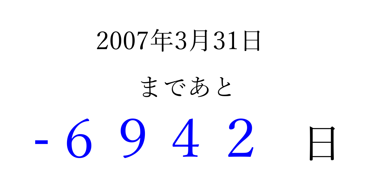 2007年3月31日(土)は もう 0000 日過ぎました 追加すると、トップページからすぐ選べるようになります ※2026/04/02現在の結果です。 最新の状態に更新する ↓シェアして、タイムライン上にカウントダウンを表示しよう!↓ 📤 この結果を共有する Tweet シェア Threads Bluesky 別の日付でカウントダウン 2007年3月のカレンダー このページをブックマークに追加すると、いつでもカウントダウンを確認できます。 (PC: Ctrl+D / Mac: ⌘+D) hitome-notes.comでは以下のページも運営しています。 指定日と期間から日付を計算 | ガチャ確率計算・シミュレーション | プライバシー・ポリシー 運営者:Avocado