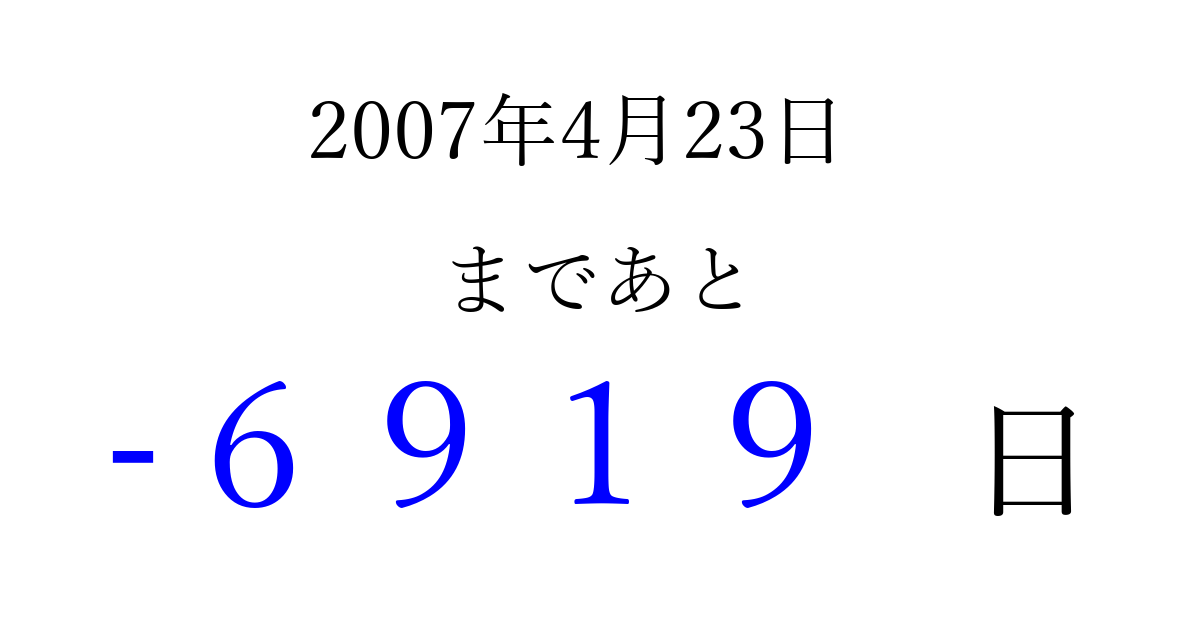 2007年4月23日(月)は もう 0000 日過ぎました 追加すると、トップページからすぐ選べるようになります ※2026/04/02現在の結果です。 最新の状態に更新する ↓シェアして、タイムライン上にカウントダウンを表示しよう!↓ 📤 この結果を共有する Tweet シェア Threads Bluesky 別の日付でカウントダウン 2007年4月のカレンダー このページをブックマークに追加すると、いつでもカウントダウンを確認できます。 (PC: Ctrl+D / Mac: ⌘+D) hitome-notes.comでは以下のページも運営しています。 指定日と期間から日付を計算 | ガチャ確率計算・シミュレーション | プライバシー・ポリシー 運営者:Avocado