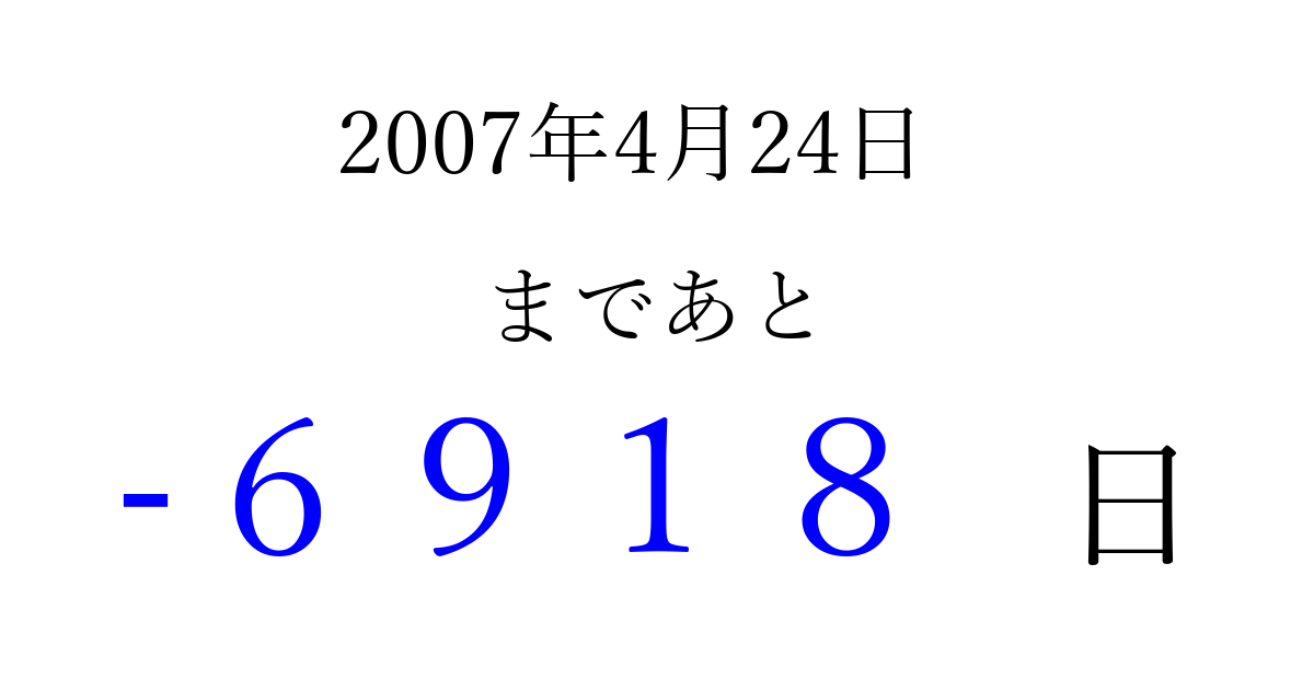 2007年4月24日(火)は もう 0000 日過ぎました 追加すると、トップページからすぐ選べるようになります ※2026/04/02現在の結果です。 最新の状態に更新する ↓シェアして、タイムライン上にカウントダウンを表示しよう!↓ 📤 この結果を共有する Tweet シェア Threads Bluesky 別の日付でカウントダウン 2007年4月のカレンダー このページをブックマークに追加すると、いつでもカウントダウンを確認できます。 (PC: Ctrl+D / Mac: ⌘+D) hitome-notes.comでは以下のページも運営しています。 指定日と期間から日付を計算 | ガチャ確率計算・シミュレーション | プライバシー・ポリシー 運営者:Avocado