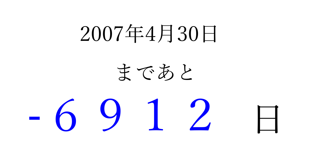 2007年4月30日(月)は もう 0000 日過ぎました 追加すると、トップページからすぐ選べるようになります ※2026/04/02現在の結果です。 最新の状態に更新する ↓シェアして、タイムライン上にカウントダウンを表示しよう!↓ 📤 この結果を共有する Tweet シェア Threads Bluesky 別の日付でカウントダウン 2007年4月のカレンダー このページをブックマークに追加すると、いつでもカウントダウンを確認できます。 (PC: Ctrl+D / Mac: ⌘+D) hitome-notes.comでは以下のページも運営しています。 指定日と期間から日付を計算 | ガチャ確率計算・シミュレーション | プライバシー・ポリシー 運営者:Avocado