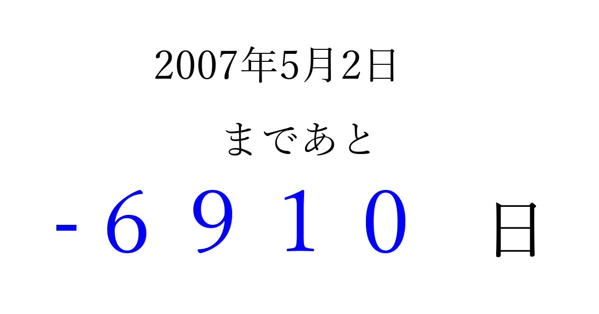 2007年5月2日(水)は もう 0000 日過ぎました 追加すると、トップページからすぐ選べるようになります ※2026/04/02現在の結果です。 最新の状態に更新する ↓シェアして、タイムライン上にカウントダウンを表示しよう!↓ 📤 この結果を共有する Tweet シェア Threads Bluesky 別の日付でカウントダウン 2007年5月のカレンダー このページをブックマークに追加すると、いつでもカウントダウンを確認できます。 (PC: Ctrl+D / Mac: ⌘+D) hitome-notes.comでは以下のページも運営しています。 指定日と期間から日付を計算 | ガチャ確率計算・シミュレーション | プライバシー・ポリシー 運営者:Avocado