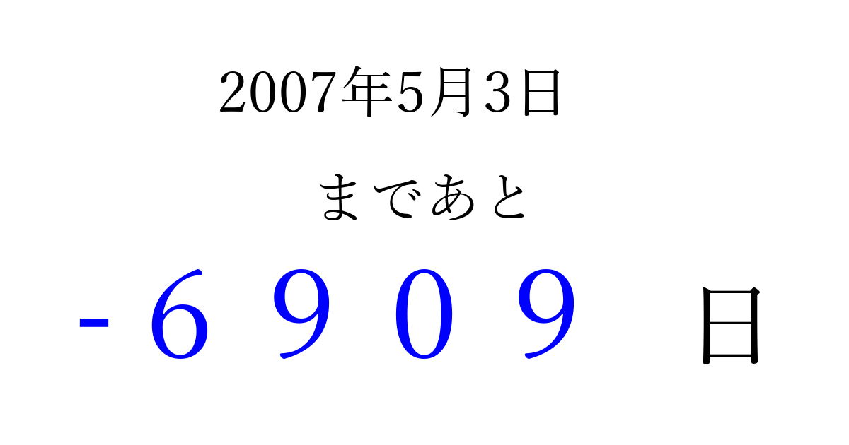 2007年5月3日(木)は もう 0000 日過ぎました 追加すると、トップページからすぐ選べるようになります ※2026/04/02現在の結果です。 最新の状態に更新する ↓シェアして、タイムライン上にカウントダウンを表示しよう!↓ 📤 この結果を共有する Tweet シェア Threads Bluesky 別の日付でカウントダウン 2007年5月のカレンダー このページをブックマークに追加すると、いつでもカウントダウンを確認できます。 (PC: Ctrl+D / Mac: ⌘+D) hitome-notes.comでは以下のページも運営しています。 指定日と期間から日付を計算 | ガチャ確率計算・シミュレーション | プライバシー・ポリシー 運営者:Avocado