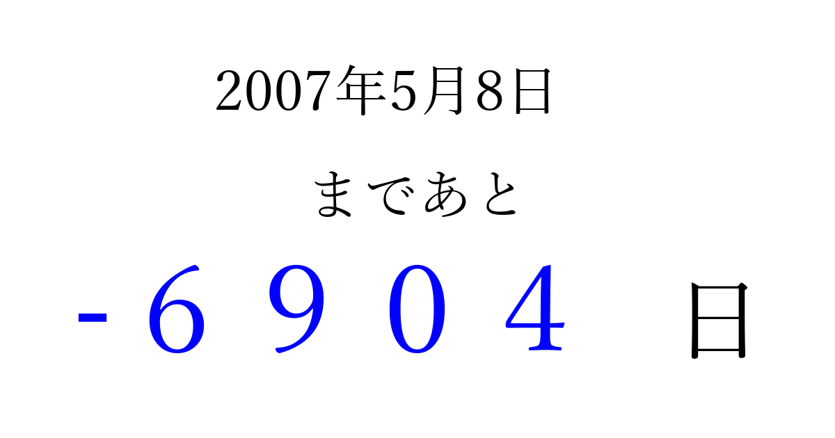 2007年5月8日(火)は もう 0000 日過ぎました 追加すると、トップページからすぐ選べるようになります ※2026/04/02現在の結果です。 最新の状態に更新する ↓シェアして、タイムライン上にカウントダウンを表示しよう!↓ 📤 この結果を共有する Tweet シェア Threads Bluesky 別の日付でカウントダウン 2007年5月のカレンダー このページをブックマークに追加すると、いつでもカウントダウンを確認できます。 (PC: Ctrl+D / Mac: ⌘+D) hitome-notes.comでは以下のページも運営しています。 指定日と期間から日付を計算 | ガチャ確率計算・シミュレーション | プライバシー・ポリシー 運営者:Avocado