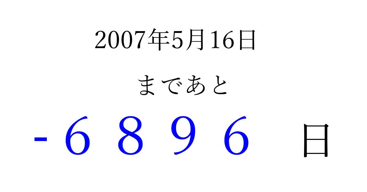 2007年5月16日(水)は もう 0000 日過ぎました 追加すると、トップページからすぐ選べるようになります ※2026/04/02現在の結果です。 最新の状態に更新する ↓シェアして、タイムライン上にカウントダウンを表示しよう!↓ 📤 この結果を共有する Tweet シェア Threads Bluesky 別の日付でカウントダウン 2007年5月のカレンダー このページをブックマークに追加すると、いつでもカウントダウンを確認できます。 (PC: Ctrl+D / Mac: ⌘+D) hitome-notes.comでは以下のページも運営しています。 指定日と期間から日付を計算 | ガチャ確率計算・シミュレーション | プライバシー・ポリシー 運営者:Avocado