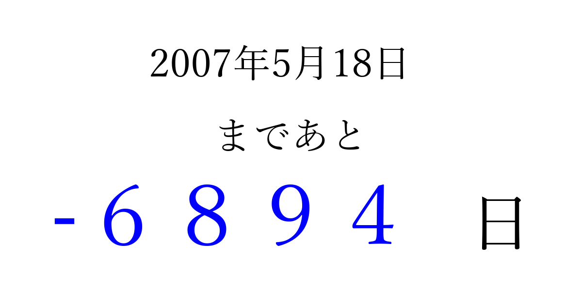 2007年5月18日(金)は もう 0000 日過ぎました 追加すると、トップページからすぐ選べるようになります ※2026/04/02現在の結果です。 最新の状態に更新する ↓シェアして、タイムライン上にカウントダウンを表示しよう!↓ 📤 この結果を共有する Tweet シェア Threads Bluesky 別の日付でカウントダウン 2007年5月のカレンダー このページをブックマークに追加すると、いつでもカウントダウンを確認できます。 (PC: Ctrl+D / Mac: ⌘+D) hitome-notes.comでは以下のページも運営しています。 指定日と期間から日付を計算 | ガチャ確率計算・シミュレーション | プライバシー・ポリシー 運営者:Avocado