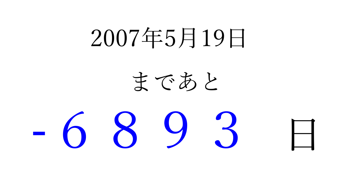 2007年5月19日(土)は もう 0000 日過ぎました 追加すると、トップページからすぐ選べるようになります ※2026/04/02現在の結果です。 最新の状態に更新する ↓シェアして、タイムライン上にカウントダウンを表示しよう!↓ 📤 この結果を共有する Tweet シェア Threads Bluesky 別の日付でカウントダウン 2007年5月のカレンダー このページをブックマークに追加すると、いつでもカウントダウンを確認できます。 (PC: Ctrl+D / Mac: ⌘+D) hitome-notes.comでは以下のページも運営しています。 指定日と期間から日付を計算 | ガチャ確率計算・シミュレーション | プライバシー・ポリシー 運営者:Avocado