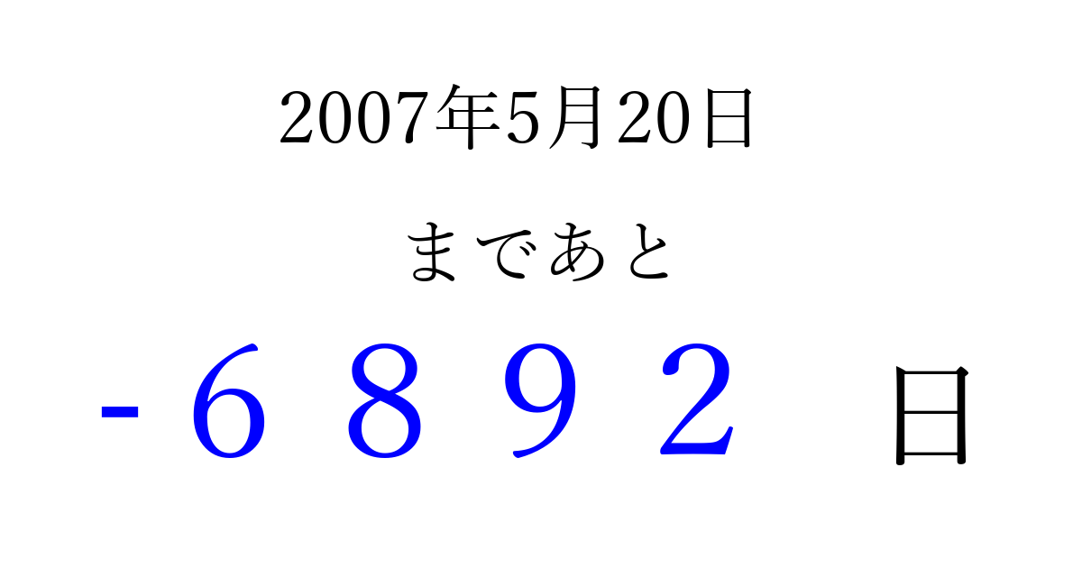 2007年5月20日(日)は もう 0000 日過ぎました 追加すると、トップページからすぐ選べるようになります ※2026/04/02現在の結果です。 最新の状態に更新する ↓シェアして、タイムライン上にカウントダウンを表示しよう!↓ 📤 この結果を共有する Tweet シェア Threads Bluesky 別の日付でカウントダウン 2007年5月のカレンダー このページをブックマークに追加すると、いつでもカウントダウンを確認できます。 (PC: Ctrl+D / Mac: ⌘+D) hitome-notes.comでは以下のページも運営しています。 指定日と期間から日付を計算 | ガチャ確率計算・シミュレーション | プライバシー・ポリシー 運営者:Avocado
