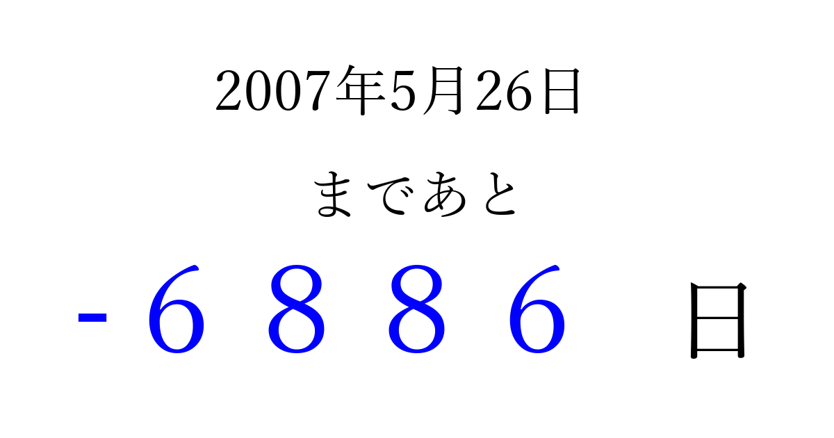 2007年5月26日(土)は もう 0000 日過ぎました 追加すると、トップページからすぐ選べるようになります ※2026/04/02現在の結果です。 最新の状態に更新する ↓シェアして、タイムライン上にカウントダウンを表示しよう!↓ 📤 この結果を共有する Tweet シェア Threads Bluesky 別の日付でカウントダウン 2007年5月のカレンダー このページをブックマークに追加すると、いつでもカウントダウンを確認できます。 (PC: Ctrl+D / Mac: ⌘+D) hitome-notes.comでは以下のページも運営しています。 指定日と期間から日付を計算 | ガチャ確率計算・シミュレーション | プライバシー・ポリシー 運営者:Avocado