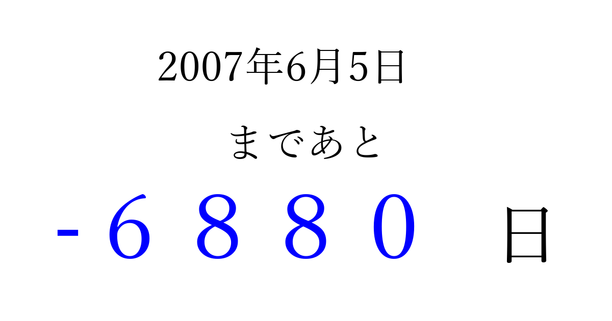 2007年6月5日(火)は もう 0000 日過ぎました 追加すると、トップページからすぐ選べるようになります ※2026/04/06現在の結果です。 最新の状態に更新する ↓シェアして、タイムライン上にカウントダウンを表示しよう!↓ 📤 この結果を共有する Tweet シェア Threads Bluesky 別の日付でカウントダウン 2007年6月のカレンダー このページをブックマークに追加すると、いつでもカウントダウンを確認できます。 (PC: Ctrl+D / Mac: ⌘+D) hitome-notes.comでは以下のページも運営しています。 指定日と期間から日付を計算 | ガチャ確率計算・シミュレーション | プライバシー・ポリシー 運営者:Avocado