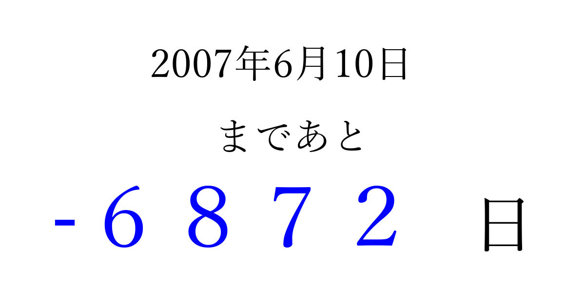 2007年6月10日(日)は もう 0000 日過ぎました 追加すると、トップページからすぐ選べるようになります ※2026/04/03現在の結果です。 最新の状態に更新する ↓シェアして、タイムライン上にカウントダウンを表示しよう!↓ 📤 この結果を共有する Tweet シェア Threads Bluesky 別の日付でカウントダウン 2007年6月のカレンダー このページをブックマークに追加すると、いつでもカウントダウンを確認できます。 (PC: Ctrl+D / Mac: ⌘+D) hitome-notes.comでは以下のページも運営しています。 指定日と期間から日付を計算 | ガチャ確率計算・シミュレーション | プライバシー・ポリシー 運営者:Avocado