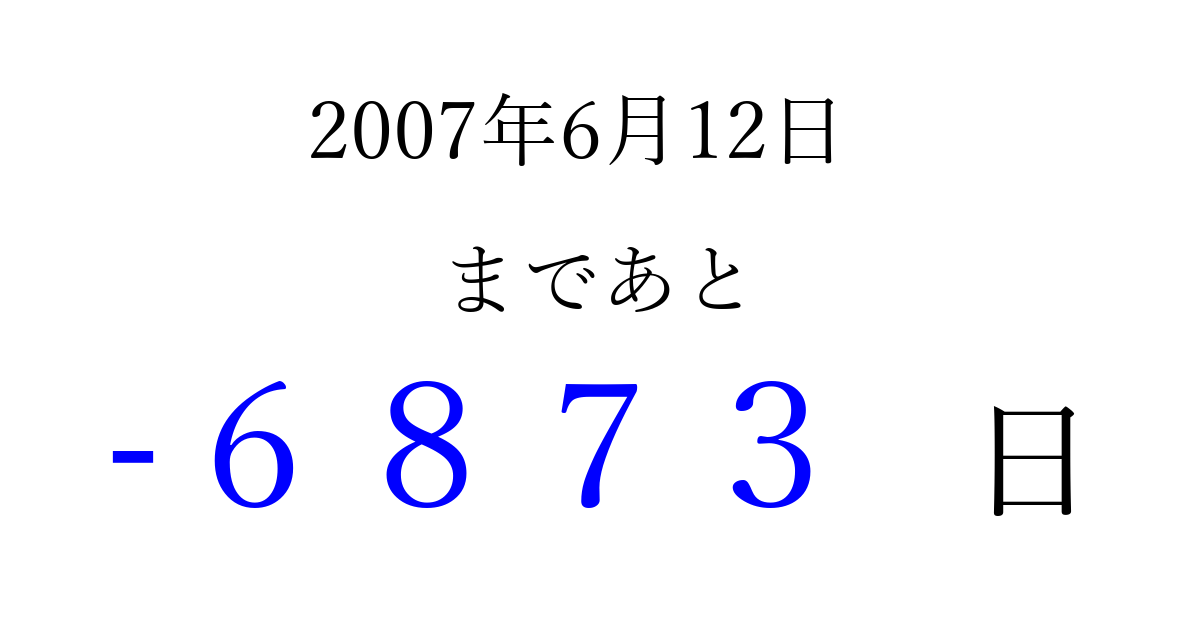 2007年6月12日(火)は もう 0000 日過ぎました 追加すると、トップページからすぐ選べるようになります ※2026/04/06現在の結果です。 最新の状態に更新する ↓シェアして、タイムライン上にカウントダウンを表示しよう!↓ 📤 この結果を共有する Tweet シェア Threads Bluesky 別の日付でカウントダウン 2007年6月のカレンダー このページをブックマークに追加すると、いつでもカウントダウンを確認できます。 (PC: Ctrl+D / Mac: ⌘+D) hitome-notes.comでは以下のページも運営しています。 指定日と期間から日付を計算 | ガチャ確率計算・シミュレーション | プライバシー・ポリシー 運営者:Avocado