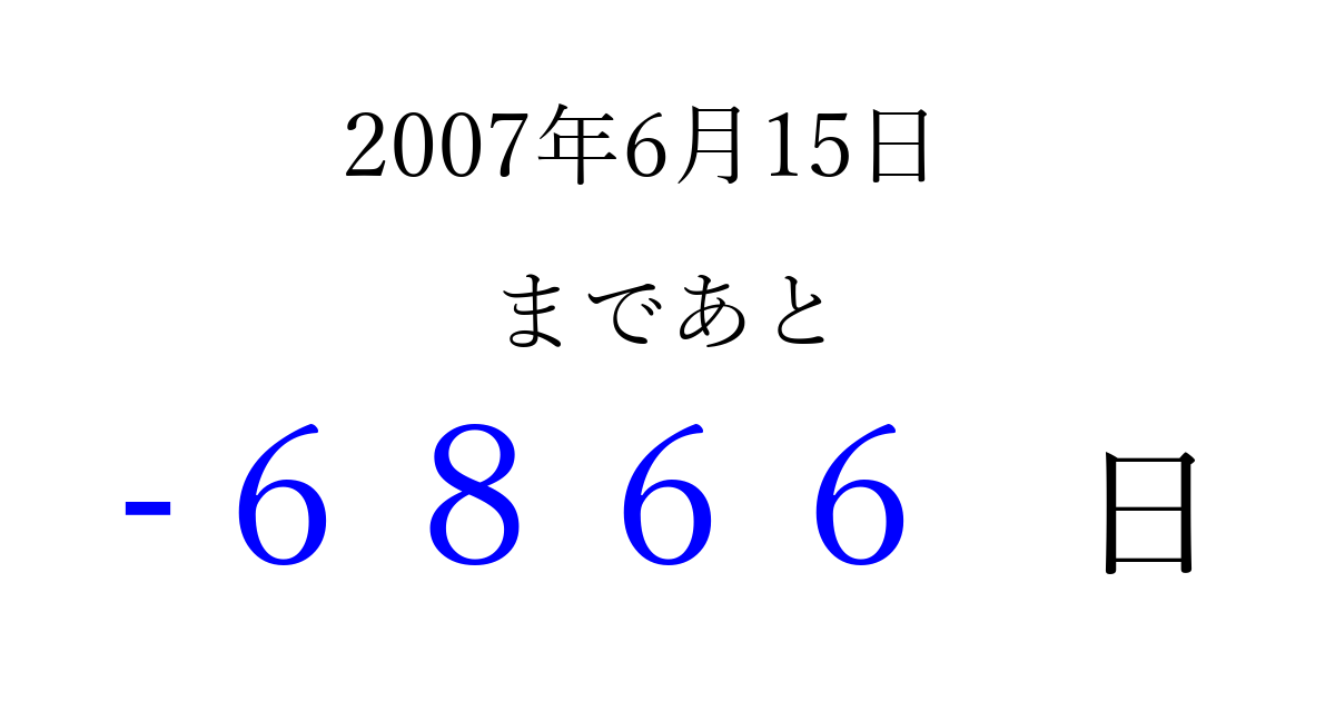 2007年6月15日(金)は もう 0000 日過ぎました 追加すると、トップページからすぐ選べるようになります ※2026/04/02現在の結果です。 最新の状態に更新する ↓シェアして、タイムライン上にカウントダウンを表示しよう!↓ 📤 この結果を共有する Tweet シェア Threads Bluesky 別の日付でカウントダウン 2007年6月のカレンダー このページをブックマークに追加すると、いつでもカウントダウンを確認できます。 (PC: Ctrl+D / Mac: ⌘+D) hitome-notes.comでは以下のページも運営しています。 指定日と期間から日付を計算 | ガチャ確率計算・シミュレーション | プライバシー・ポリシー 運営者:Avocado